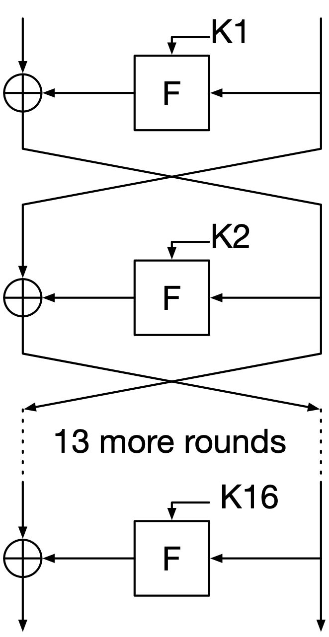 \(F\) is the round function, and \(K_1\) etc. are the subkeys. Each arrow represents 32 bits, except for the subkeys, which are each 48 bits. Note that the halves are not swapped after the last round.